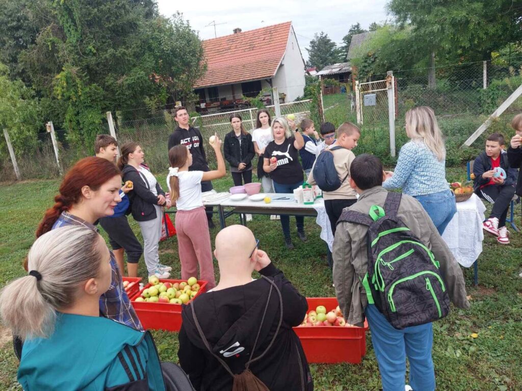 Radionice su vodile nastavnice Kristina Gajić i Mirela Višaticki. U voćnjaku su učenici zajedno s učiteljicama i pomoćnicama u nastavi brali jabuke, te iste pripremali kao naribane i rezane na kockice. Osim u svježem obliku, kušali su i jabuke u soku te našoj poznatoj piti koju su izradili učenici zanimanja pekar i pomoćni pekar sa svojim nastavnicima i suradnicom u nastavi. U ovoj radionici pomogli su nam i učenici 3.b razreda, Patrik, Klara i Anamarija.