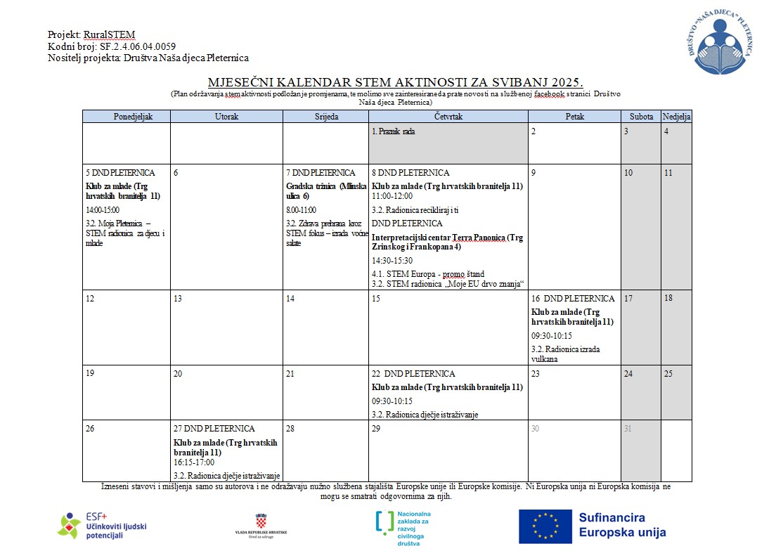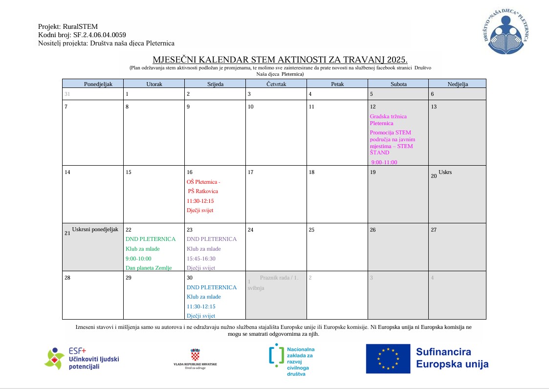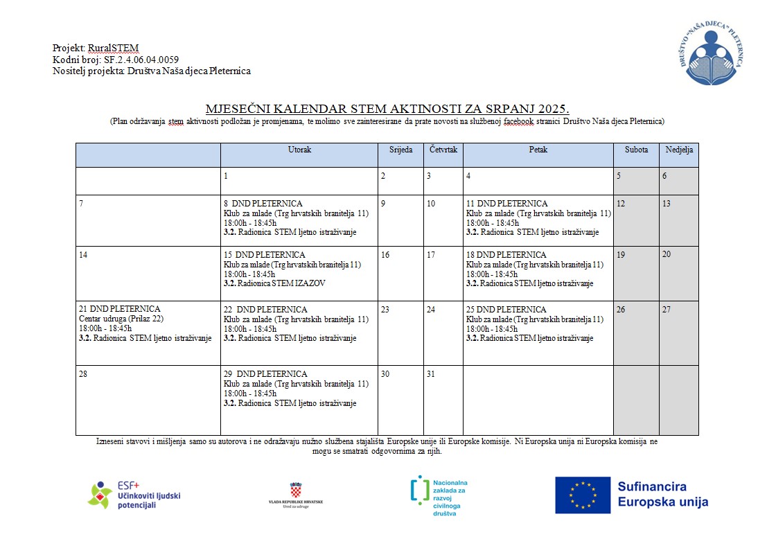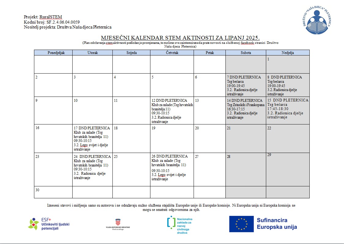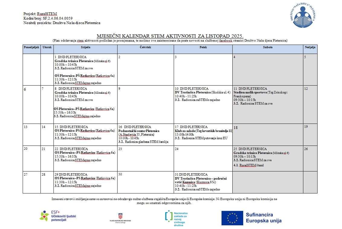 OPIS PROJEKTA: Projekt RuralSTEM ima za cilj unaprijediti kapacitete civilnog društva za promociju STEM-a. Kroz izobrazbu i mentoriranje, projekt potiče suradnju između visokih učilišta i odgojno-obrazovnih institucija. Fokus je na promicanju STEM područja među djecom i učenicima kroz radionice, sajmove i javne događaje, s naglaskom na hranu, tehnologiju, turizam i glazbu, s ciljem jačanja vještina i socijalne inkluzije.
